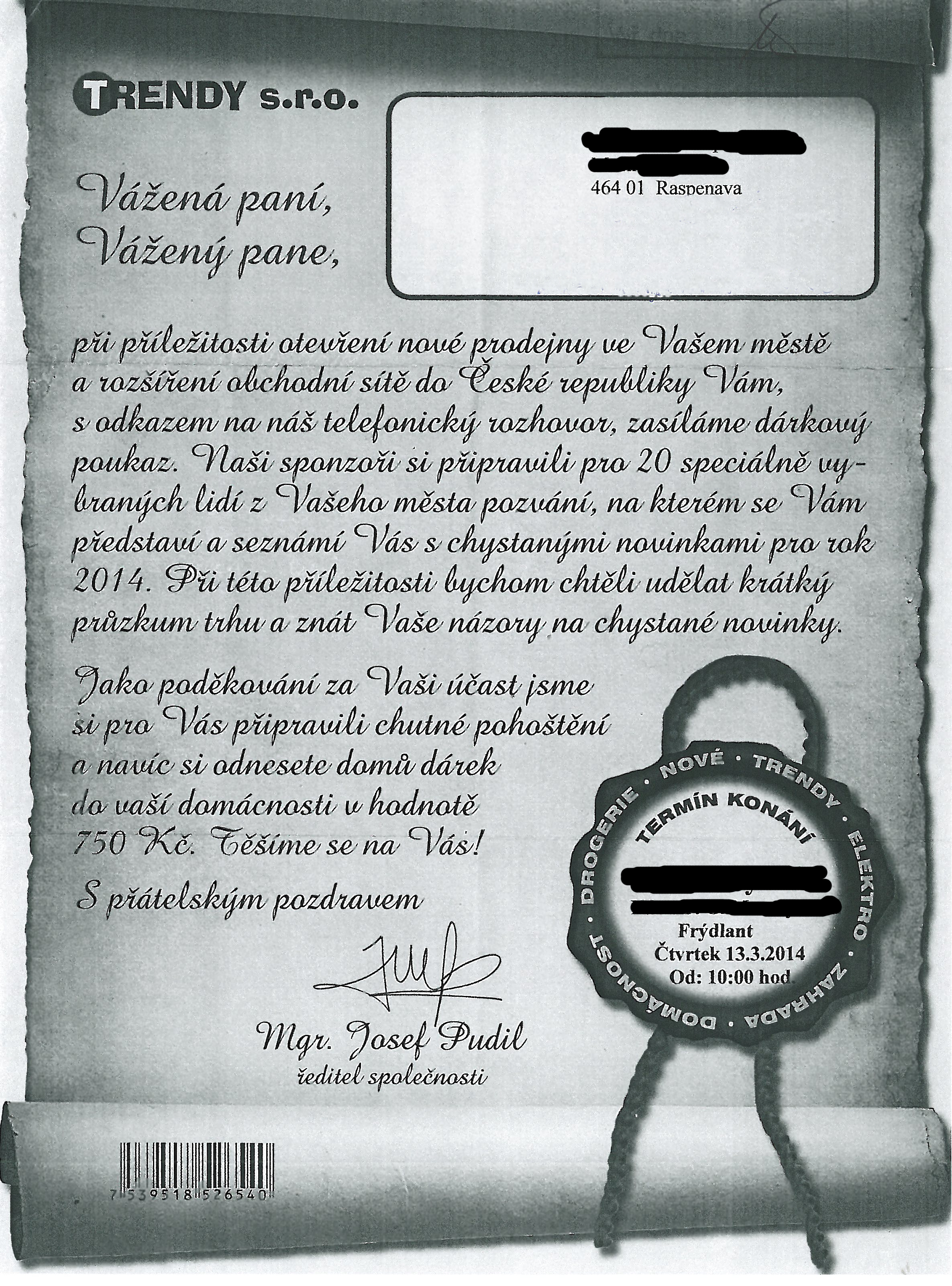 Inspektorát České obchodní inspekce v Severních Čechách řeší v současné době několik podnětů spotřebitelů na společnost TRENDY s. r. o. Tato společnost podle registrů podnikajících osob vůbec neexistuje, přesto čile působí na trhu a bezostyšně načerno pořádá předváděcí akce. Pracovníci této společnosti pod různými záminkami oslovují na ulicích větších měst zejména spotřebitele důchodového věku a snaží se získat jejich osobní údaje – jméno, adresu a telefonní číslo. Následuje telefonické pozvání na předváděcí akci do sálu pronajatého v místní restauraci.
