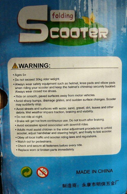 (Praha 16. říjen 2012) Sérii rizikových výrobků zjištěných na trhu v rámci kontrolní akce České obchodní inspekce zaměřené na koloběžky (viz tisková zpráva ze dne 17. 8. 2012), doplňuje koloběžka Folding Scooter. K úrazu dětského uživatele po pádu přes řídítka může snadno dojít zejména díky selhání blokovacího mechanismu výsuvné tyče řídítek. Prodej koloběžky Scooter folding byl zakázán a vzhledem k vysoké míře rizika bude tento výrobek nahlášen do výstražného systému RAPEX.