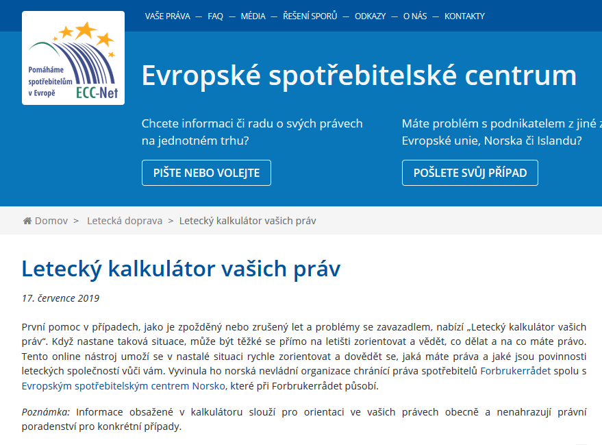 (Praha, 17. červenec 2019) Češi si mohou ode dneška velmi rychle a snadno přímo na letišti zjistit, na co mají právo v případě zrušení nebo zpoždění letu a při problémech se zavazadly. Evropské spotřebitelské centrum na svém webu spustilo „Letecký kalkulátor vašich práv“, který po zadání místa odletu a příletu okamžitě sdělí, co mohou cestující v konkrétní situaci dělat a požadovat, resp. jaké povinnosti vůči nim má dopravce. Online kalkulátor je dostupný bezplatně a v češtině na webu www.evropskyspotrebitel.cz/kalkulator